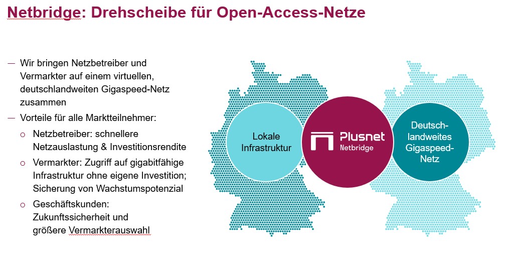 Mit „Netbridge“ leistet Plusnet einen wichtigen Beitrag für den digitalen Aufbruch in Deutschland. Denn mit der Open-Access-Plattform stellen wir eine schnelle, flächendeckende Verfügbarkeit von Gigabit-Netzen im gesamten Bundesgebiet sicher, verhindern den Überbau von Infrastrukturen und ermöglicht so den effizienten und zielgerichteten Einsatz von Finanzmitteln – auf privatwirtschaftlicher wie staatlicher Seite. Mit „Netbridge“ bereitet Plusnet den Weg in eine moderne Plattformökonomie.