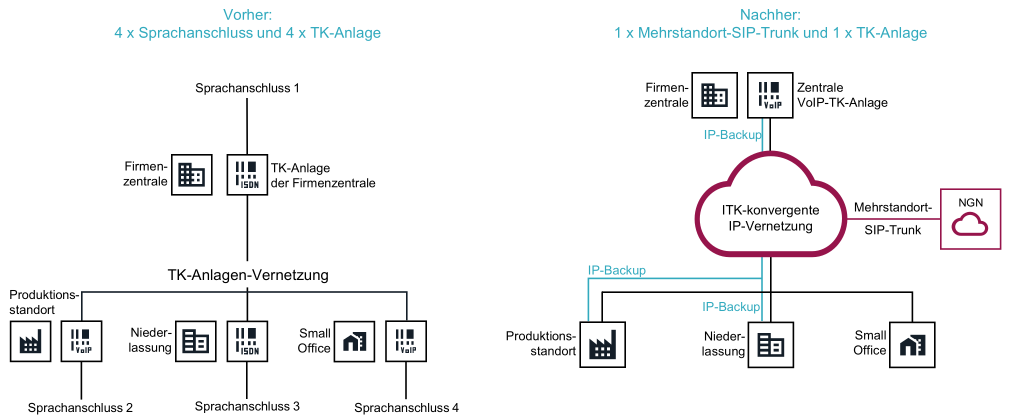 Hier ist zu berücksichtigen, dass alle vier „Einzelgewerke“ funktionieren müssen, damit VoIP funktioniert: das NGN-Netz des ITSP samt seinem Backbone, das den SIP-Trunk-Dienst liefert, die LAN-IP-Vernetzung am Kundenstandort, die Kunden-TK-Anlage samt ihrer Telefone und die WAN-IP-Vernetzung des Providers/Carriers.