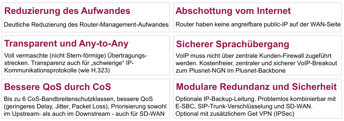 - ITSP-Backbone: Die Plusnet GmbH hat als ITSP und Carrier ihr Backbone und alle NGN-Komponenten redundant als „Highly Available“ (HA) ausgeführt und mit einem ISO-27001-zertifizierten Informationssicherheits-Managementsystems (ISMS) über Jahre hinweg stabilisiert. Der SIP-Trunk-Dienst kann konkret über redundante, ortsunabhängige Session Border Controller (SBC) zur Verfügung gestellt werden und erreicht so die höchste Verfügbarkeit der vier Einzelgewerke.